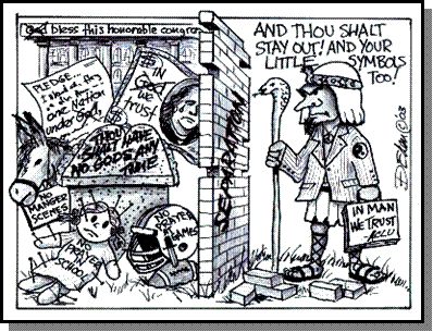 Sound great? Won’t you join us? We’ve made some wonderful advances! Schools don’t make our children celebrate Christmas anymore! Students can’t be forced to listen to prayers in class or at their games or even their graduation events! It’s so exciting! Teachers can’t read from the Bible or express their religious views to kids anymore! Cool! And hey, we’re getting those creepy manger scenes, and even Christmas trees, OFF CITY PROPERTY! Oh Yeah! We even got the Boy Scouts kicked out of a park because they have God in their code. Are we on a roll or what! And you’d better believe we’ll get those dusty old Ten Commandments beaten back into the churches where they belong! And just watch us get that big cross torn down in San Diego! Everyone knows that governments must never suggest, even symbolically, anything religious! Man! What a sweet time to be alive!